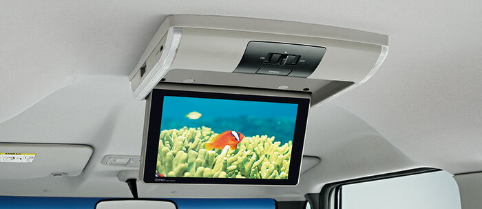 for ギャザズナビVM-155N(W-VGAモニター・ルーフ取付タイプリモコン付)9インチ W-VGAモニター。便利なLEDルームランプ付き。※点灯イメージは撮影のため点灯した状態を強調し再現したもので、実際の点灯色とは異なります。※VXM-155VSi、VXM-155Cには装着できません。※インテリアガードパネル、セパレートカーテン、プラズマクラスター搭載LEDルーフ照明、「ナノイー」うるケア・ヴェールライトとの同時装着はできません。※リア席モニターではナビゲーション地図表示映像はご覧になれません。※ルーフライニング色とは異なります。※HDMI接続でナビゲーションに入力した画像・映像はリア席モニターには表示されません。