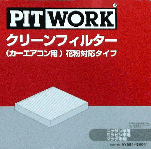 ☆ 関連商品 ☆わさびの抗菌パワーでエアコンのイヤな臭いを元からカット!クリーンフィルターと同時に使用すると高い効果が期待できます。カーエアコン消臭抗菌剤 ≪わさびd’air (ワサビデェール)≫ 交換レベル ◎基本的に道具を使用せずに交換が可能(一部に道具を使用した簡単な作業が必要な車種あり) ○基本的に道具を使用しないが、グローブボックスの取り外しが必要(一部に道具を使用した簡単な作業が必要な車種あり) △道具を使用し、グローブボックスやハーネス等の取外し作業が必要。 ☆道具を使用し、一部部品への切り欠き加工等の難易度の高い作業が必要。 ■ 関連商品 ■ エアコンのニオイの原因菌を、 丸ごと洗浄してみませんか? 抗菌効果も約半年間も持続! ≪エバポレーター洗浄・抗菌剤 6ヶ月≫LLCの性能を回復! ≪クーラントプラス≫ Sorry,We can't accept credit card from foreign customer.The method of payment is Japanese credit card or bank transfer in advance.ニッサン純正部品 純正パーツ エアコンフィルター エアコンクリーンフィルターエアコンフィルタ クリーンフィルタ カーエアコンフィルタ カーエアコンフィルター カークリーンフィルター カークリーンフィルタ PITWORK ピットワーク PM2.5 PM2.5もキャッチします!PITWORKカーエアコンフィルター NISSAN純正部品 日産純正部品車種別クリーンフィルター(エアコンフィルター)信頼の高性能が快適な車室内環境をお約束します! 花粉はもちろん、 大気汚染物質「PM2.5」にも対応! 有害物質から身を守るのに役立ちます! フィルターで捕縛可能な物質・PM2.5・花粉・排気ガス粒子(0.1〜1μm)・硫黄酸化物 ・窒素酸化物 等の化学物質単位まで捕縛可能! 花粉対応タイプ花粉・におい・アレルゲン対応タイプ 定価 2,205円 (税込)定価 4,935円 (税込) 花粉・粉塵をダブルの効果でキャッチ! (両タイプ) 目の細かさと通気性を両立し、さらに素材に帯電性を持たせた特殊製法の極細繊維帯電不織布※を採用しました。目の細かい素材と静電気による吸着ダブル効果で、従来品では対応できなかった花粉ユービッシュ体などの超微粒子までガッチリとキャッチします。※極細繊維帯電不織布(ごくぼそせんいたいでんふしょくふ)合成繊維を織らないで布のように仕上げたフェルト状の材質が「不織布」 イヤなにおいをブロック (花粉・におい・アレルゲン対応タイプ) フィルター内の活性炭表面積を広げる工夫により、活性炭効果を高めました。イヤなにおいだけではなく、自動車の排気ガスに混入している「窒素酸化物」「硫黄酸化物」などの有害物質も強力に吸着します。 アレルゲン抑制力を強化! (花粉・におい・アレルゲン対応タイプ) アレルゲン抑制機能を持つハーブ系天然ポリフェノール(タンニン酸)をフィルター表面に添着することで、車室内のアレルゲン活動を抑制します。(イラスト参照)特に、ダニ・スギ花粉・カビ・イヌネコなどのアレルゲン物質に対して、高い抑制力を発揮します。※「アレルゲン」とは、身体に異常な反応を起こさせる物質のことです。アレルゲンが抗体と結びつくことにより肥満細胞がヒスタミンなどの物質を放出し(粘膜等を刺激して)、アレルギーを起こします。一般的にはタンパク質が主成分です。 ■ クリーンフィルター Q&A ■ Q1クリーンフィルターってなんですか? A1家庭のエアコンと同様にカーエアコンにもエアコン用フィルターが付いています。外気から取り込む空気を洗浄するのと同時に、車内の空気循環で車内に入った花粉もキャッチします。 Q2クリーンフィルターってどこについてるの? A2大別するとグローブボックスの奥に付いている車(ブロアタイプ)と運転席足元についている車(ユニットタイプ)の2種類に分かれます。最近の車は主にブロアタイプです。 Q3クリーンフィルターの交換は簡単なの? A3車種によって交換方法は異なります。メーカー別適用車種一覧表に交換レベルが記載されておりますので、ご参照ください。 Q4交換の目安は? A41年に1度の交換をお勧め致します。フィルターの交換を怠るとフィルターにたまった花粉やホコリが排気を妨げ、エアコンの風量が低下したり、ガラスが曇りやすくなります。 Q5クリーンフィルターは何を取ってくれるの? A5PITWORKのクリーンフィルターには2種類あります。1.「花粉対応タイプ」 外気に漂う、スギやヒノキなどの花粉、ホコリやチリなどをブロックします。2.「花粉・におい・アレルゲン対応タイプ」 「花粉対応タイプ」に加え、車外からの排気ガス、またはタバコやペットなどの臭いを活性炭が吸着除去します。 さらにフィルター表面のポリフェノール系抗アレルゲン剤がアレルゲンの周囲に付着し、アレルゲンを抗体に付着しづらくさせます。 Q6アレルゲンとは? A6身体に異常な反応を起こさせる物質の事です。アレルゲンが抗体と結びつくことにより、肥満細胞がヒスタミンなどの物質を放出し(粘膜等を刺激して)、アレルギーを引き起こします。一般的にはタンパク質が主成分です。 フィルターの