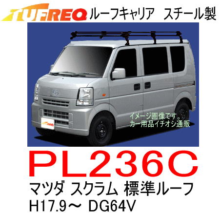 主な適合・仕様車種名タイプ年式車両形式最大積載量スクラム標準ルーフH27.3〜DG17V/DG17W50kg荷台サイズ(mm)キャリア高さ D(mm)脚取付幅 E(mm)長さA幅B高さCフロント側センター側リア側1,9901,3301002521,3551,3501,332商品説明・精興工業のルーフキャリア、TUFREQ(タフレック)PL437Aです。・アルミ材をメインフレームにエアロフォルムと耐久性を兼ね備え高級感・存在感をアピールする最上級グレードルーフキャリアです。抜群の安定感でコンパクトな荷物はもちろんのこと、あらゆる荷物を安定して運ぶことができます。 ・前後回転パイプを採用、上下自由に可動するので小荷物からハシゴ等まで自由にレイアウトできます。簡単な操作でフルフラットになるためハシゴ、材木、パイプなどの長尺物の積載も容易です。・車種専用の設計なのでフッティングも抜群。ビジネスからレジャーまで幅広くお使いいただけます。※メーカー適合はこちらです。なお、適合がわからない場合は当社までお問い合わせいただければお調べさせていただきますのでお気軽にメール、電話にてお問い合わせくださいませ。※TUFREQは組み立て式のキャリアになりますので、お客様での組立が必要になります。なお必要なパーツは全て付属されております。・TUFREQシリーズは延長キットや保護フィルムなどのオプション品がございます。※オプションもご一緒にどうぞ。●スクラム(標準ルーフ/H27.3〜)用のラインアップハイグレードにセンスアップ!アルミ製ハイグレードキャリアHシリーズ普及実績No.1モデル!黒塗装スチール製キャリアPシリーズミドル6本脚・HL437Aミドル6本脚・PL437A本製品の適合について・本製品はスクラム(H27.3〜)標準ルーフ車専用です。・ハイルーフ車用はこちらになります。※写真は装着イメージになります。
