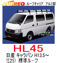 主な適合・仕様車種名タイプ年式車両形式最大積載量キャラバン標準ルーフS61.10〜H13.5E2450kg荷台サイズ(mm)キャリア高さ D(mm)脚取付幅 E(mm)長さA幅B高さC2,9401,3551202951,168〜1,448商品説明・精興工業のルーフキャリア、TUFREQ(タフレック)HL45です。 ・アルミ材をメインフレームにエアロフォルムと耐久性を兼ね備え高級感・存在感をアピールする最上級グレードルーフキャリアです。抜群の安定感でコンパクトな荷物はもちろんのこと、あらゆる荷物を安定して運ぶことができます。 ・前後回転パイプを採用、上下自由に可動するので小荷物からハシゴ等まで自由にレイアウトできます。簡単な操作でフルフラットになるためハシゴ、材木、パイプなどの長尺物の積載も容易です。 ・キャリア専門メーカーならではの4本脚から10本脚まで幅広いラインアップ。車種専用の設計なのでフッティングも抜群。ビジネスからレジャーまで幅広くお使いいただけます。 ※メーカー適合はこちらです。なお、適合がわからない場合は当社までお問い合わせいただければお調べさせていただきますのでお気軽にメール、電話にてお問い合わせくださいませ。 ※TUFREQは組み立て式のキャリアになりますので、お客様での組立が必要になります。なお必要なパーツは全て付属されております。●キャラバン(標準ルーフ)用のラインアップハイグレードにセンスアップ!アルミ製ハイグレードキャリアHシリーズショート4本脚・HL42ミドル6本脚・HL43ロング8本脚・HL44超ロング10本脚・HL45普及実績No.1モデル!黒塗装スチール製キャリアPシリーズショート4本脚・PL42ミドル6本脚・PL43ロング8本脚・PL44超ロング10本脚・PL45コストパフォーマンスNo.1モデル!メッキ処理スチール製キャリアLシリーズロング8本脚・L550あわせてオススメ!リアラダーアルミパイプを採用し、軽量で耐久性に優れたスタイル。 リアラダーとルーフキャリアの組み合わせで作業性を大幅にアップ! 背の高い車両でも、ルーフキャリアへの荷物の積み下ろしはリアラダーを使えばラクラク作業! キャラバン用のリアラダーはこちら本製品の適合について・本製品はキャラバン(S61.10〜H13.5)標準ルーフ車専用です。・H24.6〜 NV350キャラバン・標準ルーフ車用はこちらです。・H24.6〜 NV350キャラバン・ハイルーフ(標準幅)車用はこちらです。・H24.12〜 NV350キャラバン・ワイドハイルーフ車用はこちらです。・H13.5〜H24.6 標準ルーフ車用はこちらです。・H13.5〜H24.6 ハイルーフ車用はこちらです。・S61.10〜H13.5 ハイルーフ車用はこちらです。※写真は装着イメージになります。