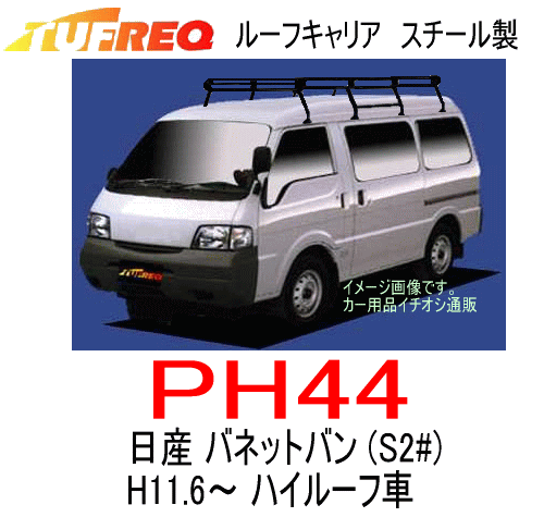 適合車種:日産 バネットバン H11.6〜 (S2#) ハイルーフ車サイズ・仕様(mm)ルーフタイプ品 番荷台サイズキャリア高さD脚取付幅E 長さ A幅 B高さ C 雨ドイ付車ハイルーフPH442,2251,330100401〜5151,226〜1,594 お車への適合品は車種ごとに異なります。【適合検索ナビ】で、品番をご確認下さい。TUFREQ(タフレック) PH44 スチール製ルーフラック 8本脚 普及実績No.1 装着共通イメージ画像 スチール材に黒塗装をした、ビジネスユーザーに最も人気の仕様。市場での普及実績No.1モデル! 職人キャリア ブラックの外観は車のカラーを選ばずスマート、そして汚れにも強く耐久性も抜群なので長くお使いいただけます。ビジネス用途に徹底した、職人キャリアです。 前後回転パイプ 前後の回転パイプは、上下に回転式!簡単な操作でフルフラットになり長尺物の積載が可能となります。 ▼車両への適合確認 ご注文前に車種適合を必ずご確認お願いします。 メーカーホームページの【適合検索ナビ】で、お車への適合品が確認出来ます。 ご不明な点は当店までお問い合わせお願いいたします。 TUFREQ 適合表 (Pシリーズで検索して下さい。) ▼適合表へのリンク(メーカーサイト)