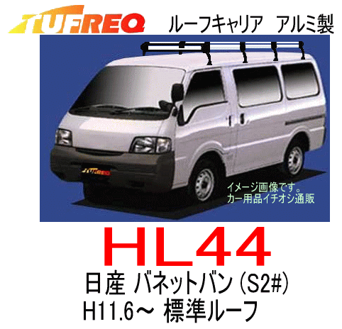 主な適合・仕様車種名タイプ年式車両形式最大積載量バネットバン標準ルーフH11.6〜S2#系50kg荷台サイズ(mm)キャリア高さ D(mm)脚取付幅 E(mm)長さA幅B高さC2,2401,3551202951,168〜1,448商品説明・精興工業のルーフキャリア、TUFREQ(タフレック)HL44です。・アルミ材をメインフレームにエアロフォルムと耐久性を兼ね備え高級感・存在感をアピールする最上級グレードルーフキャリアです。抜群の安定感でコンパクトな荷物はもちろんのこと、あらゆる荷物を安定して運ぶことができます。・前後回転パイプを採用、上下自由に可動するので小荷物からハシゴ等まで自由にレイアウトできます。簡単な操作でフルフラットになるためハシゴ、材木、パイプなどの長尺物の積載も容易です。 ・キャリア専門メーカーならではの4本脚から10本脚まで幅広いラインアップ。車種専用の設計なのでフッティングも抜群。ビジネスからレジャーまで幅広くお使いいただけます。※メーカー適合はこちらです。なお、適合がわからない場合は当社までお問い合わせいただければお調べさせていただきますのでお気軽にメール、電話にてお問い合わせくださいませ。※TUFREQは組み立て式のキャリアになりますので、お客様での組立が必要になります。なお必要なパーツは全て付属されております。●バネットバン(標準ルーフ)用のラインアップハイグレードにセンスアップ!アルミ製ハイグレードキャリアHシリーズショート4本脚・HL42ミドル4本脚・HL43ロング8本脚・HL44超ロング10本脚・HL200SP普及実績No.1モデル!黒塗装スチール製キャリアPシリーズショート4本脚・PL42ミドル6本脚・PL43ロング8本脚・PL44超ロング10本脚・PL200SPコストパフォーマンスNo.1モデル!メッキ処理スチール製キャリアLシリーズミドル6本脚・L360ロング8本脚・L460あわせてオススメ!リアラダーアルミパイプを採用し、軽量で耐久性に優れたスタイル。 リアラダーとルーフキャリアの組み合わせで作業性を大幅にアップ! 背の高い車両でも、ルーフキャリアへの荷物の積み下ろしはリアラダーを使えばラクラク作業! バネットバン用のリアラダーはこちら本製品の適合について・本製品はバネットバン(H11.6〜)標準ルーフ車専用です。・ハイルーフ(H11.6〜)車用はこちらになります。※写真は装着イメージになります。
