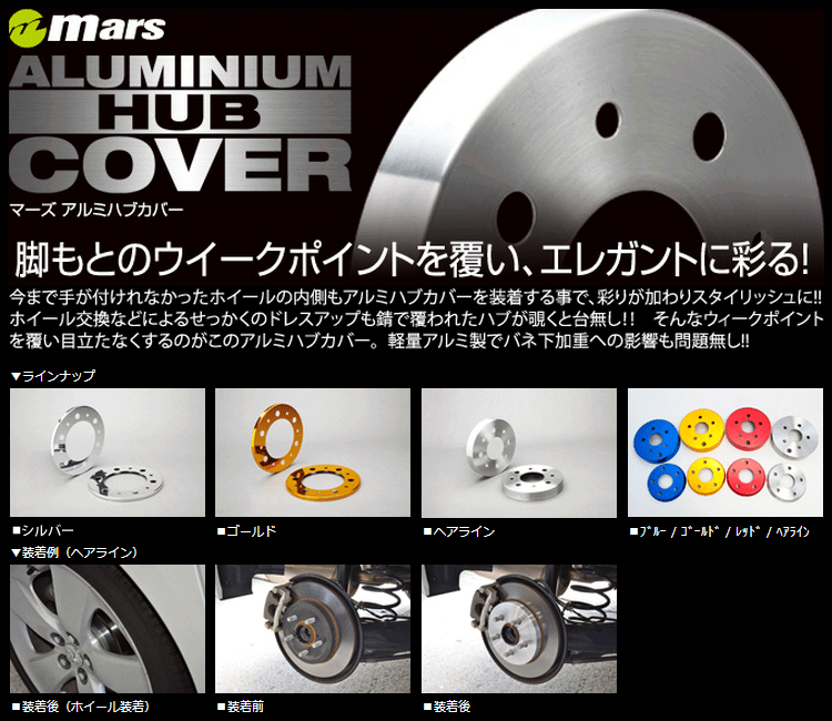 >>アイコン詳細はこちらアルミハブカバー [HCT-019]足回りをエレガントに彩る!今まで手が付けられなかったホイール内側もアルミカバーを装着することで、彩りが加わりスタイリッシュに!ホイール交換などのせっかくのドレスアップも錆で覆われたハブが覗くと台無しに。そんなウィークポイントを覆い目立たせなくするのがこのアルミハブカバー。軽量アルミ製でバネ下加重への影響も問題なし!商品名アルミハブカバーメーカーMars / マーズ品番HCT-019カラーレッド装着位置フロント用 2枚セット対応車種トヨタ カローラルミオン型式ZRE154注意事項※ご購入前に対応車種を必ずご確認ください。