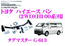 適合情報車種型式タイプ年式ハーネス形状トレーラー総重量補足事項ハイエース バンH122K/123V/182KRZH124B/183KSTANDARDH6/8〜H16/7専用750kg(最大)-取付情報形状穴あけ数加工装着時間(目安)ボールマウントF-12-3.5時間〜上-7 ※※ヒッチメンバーの高さを変えたい方はオプションボールマウントをご検討下さい。↓↓ハイエース バン(2WD)H100系用のラインアップ↓↓SUNTREXヒッチメンバーはベーシックなスチール製、見た目の美しさと実用性を兼ね備えたステンレス製、さらに取付性に優れた車種別専用ハーネス付きモデルと豊富なラインアップ。あなたのニーズに合ったヒッチメンバーがきっと見つかります。タイプ材質備考商品型番当店価格STANDARDスチール製シックなブラック仕上げ。お求めやすい価格も実現したコストパフォーマンスモデル。G-29145,864円G-613(車種別専用ハーネス付きモデル)50,274円他のお車用をお探しの方はこちらご購入前に注意事項をご確認下さい。商品説明・SUNTREXのヒッチメンバー、タグマスター 専用ハーネス付STANDARD G-613です。・20年間のヒッチメンバー開発・生産で培った経験と技術を駆使した設計によりカーメーカ純正にも採用されるほどの高い品質と安全性を実現しました。・3層表面処理を施した防錆仕様により経年劣化を抑え、よりハードな仕様にも耐えるタフな設計。より永くご使用した時にのヒッチとの違いがわかる高品質。ジェットスキー、モーターボート、バスボート、トレーラー等のけん引に威力を発揮。・クロスメンバーとサイドブラケットを分割デザインとし(※)、コンピューターの解析プログラムを用いた強度解析を行うことにより最善の品質・安全性を保っているばかりではなく、高精度を実現したことにより取付のし易さも抜群。また高精度な設計はガタつきを抑え、不快な振動音の少ない快適な使用を約束します。・スチール製のシックなブラック仕上げによりお求めやすい価格と高い品質を両立。※(一体型の車種もございます。)■セット内容■クロスメンバーフレーム・ボールマウント・ヒッチボールφ2インチ・7極スリーブコンセント(メス)・コンセントプレート・7芯コード(配線1.5m)・クイックディスコネクトピン・ダブルクリップ・ヒッチボールカバー・取り付けブラケット・取り付けボルト類・タイラップ※リミテッドのみバックランプステー付き。 ※セット内容及び形状は車種により異なります。当店人気のおススメオプション!●Thuleトウバーキャリア:各種 サイクルをはじめカーゴやバスケットをスタイリッシュに運ぶリアマウントキャリア。当商品に取付可能です。●SUNTREXオプションボールマウント:各種 ヒッチボールの高さ変更用のボールマウントです。製品付属のボールマウントとトレーラーの高さが合わない場合にご使用ください。 ご購入前に注意事項をご確認下さい。※納期について「在庫あり即納」と表記されているヒッチメンバーは当社に在庫が御座います。この場合は午後1時までのご注文で当日発送が可能です。※掲載の写真はイメージです。実際のものと色・形状等異なる場合があります。※記載内容、及び価格、仕様、取扱い等は予告なく変更する場合があります。 タグマスターは(株)サン自動車工業の登録商標です。※写真はイメージになります。説明のため他の車種用や他のシリーズの商品が含まれていることが御座いますのでご了承くださいませ。