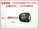 キー ブランク ジャック リモコン スペア キーレス 合い鍵 合鍵【適合車種】・メーカー:トヨタ・車種:イプサム・規格:TOY43(M382)・ブレード部長さ:47mm・ブレード部幅:8mm・ボタン位置:表面・ボタン数:2・鍵溝:外溝【商品説明】トランスミッターは純正の物をご使用下さい。電池交換の要領で簡単に交換可能です。鍵が折れてしまった場合など純正部品は非常に高いのでお安く修理が可能です。ブランクキーですので鍵屋さんにて溝を切ればお車の鍵として御使用可能です。鍵の種類やリモコンケースの種類がたくさんありますのでお間違えにならないようご注意ください。送料:送料無料 (沖縄・離島・一部地域は別途送料加算となります)【注意事項】◆お客様都合による商品ページ未確認や商品加工後の返品・交換・キャンセルは一切行えません。◆輸入商品の為、すれ・傷等がある場合が御座います。◆モニターの環境によっては実際の商品と色見などが違う場合が御座います。◆商品仕様が予告なく変更される場合が御座います。◆交換等での工賃や車両の損害などはいかなる場合も保証対象外となります。◆必ず加工/取り付け前に動作確認をして下さい。取付・加工後・脱着工賃・取付時の不備・過失傷害・水漏れ等は保証致しかねます。◆メーカー発注商品や姉妹店舗との共有在庫商品の場合、商品により納期にお時間を頂く場合やご注文のタイミングによって欠品となる可能性が御座います。お急ぎの方は事前に納期確認のご連絡を下さい。◆保証期間は商品発送日から7日間の初期不良のみです。お荷物送り状が保証書の代わりとなります。◆当店はお取り付けに関するサポートは行なっておりません。技術ある整備工場にてお取付ください。◆海外製ですので必要に応じてコーキング処理を追加してください。◆説明書は付属いたしません。◆お車によっては加工が必要な場合がございます。◆車種対応については、グレードや年式によって適合が異なる場合がある為、必ずご購入前に現車にて形状・スペース・サイズのご確認の上、最終的な判断はお客様でお願いします。◆社外品の場合、純正品では御座いませんので完全一致にはなりません。◆お客様御自身での取付作業によるいかなる損害も責任を負いかねますのでご了承ください。◆付属品以外を利用しての取付けは自己責任で行って下さい。予めご了承下さい。・ブランクキーとは鍵の旋盤加工前のものをさします。・送信機トランスミッター、イモビチップは付属致しませんので現在お使いの物を移設し鍵山は鍵専門店で加工をお願い致します。(内部にすこし接触する基盤がありますが、少し削って頂きますと問題無く使用できます。)・製造流通過程で生ずるキズ、汚れ、バリは予めご了承下さい。・鍵専門店へ合鍵作成依頼の前に、基盤の移植を行い、 正しく動作するかご確認下さい。・合鍵製作後は、第三者責任に移行するため、イモビの移植に失敗した、エンジンが始動しない、シリンダーに異常などトラブルが発生した場合、当方では一切責任を負いかねますので、自己責任において合鍵のご依頼をお願いします。・製造流通過程で生ずるキズ、汚れ、バリはノンクレームでお願いします。・画像にサイズの記載が有る場合は画像のサイズを優先して確認して下さい。・サイズに関しては、誤差が生じる場合が御座います。
